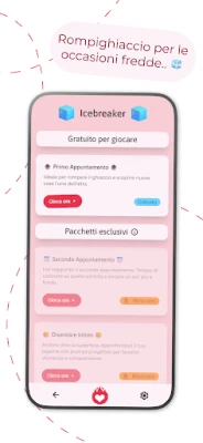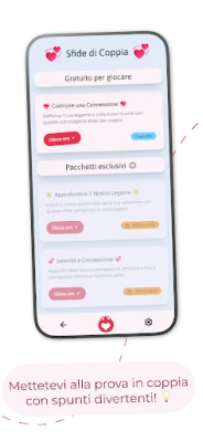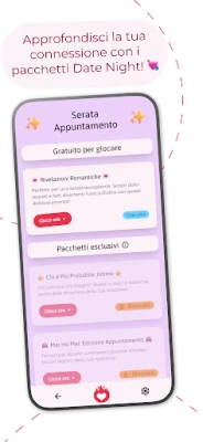 Dojo Date offre un universo di possibilità per ogni occasione, grazie a una selezione curata di pacchetti tematici in continua evoluzione. Esplorate gli "Icebreaker per appuntamenti" con domande leggere e divertenti, perfetti per rompere il ghiaccio in modo giocoso. Cimentatevi nelle "Sfide per coppie", attività pensate per essere vissute insieme, che vi porteranno a esplorare nuove dinamiche. E per chi desidera toccare corde più profonde, le "Domande profonde" guideranno conversazioni significative, rivelando sfumature inedite del vostro partner. L'offerta si arricchisce regolarmente con nuovi contenuti, garantendo sempre un'esperienza fresca e stimolante.